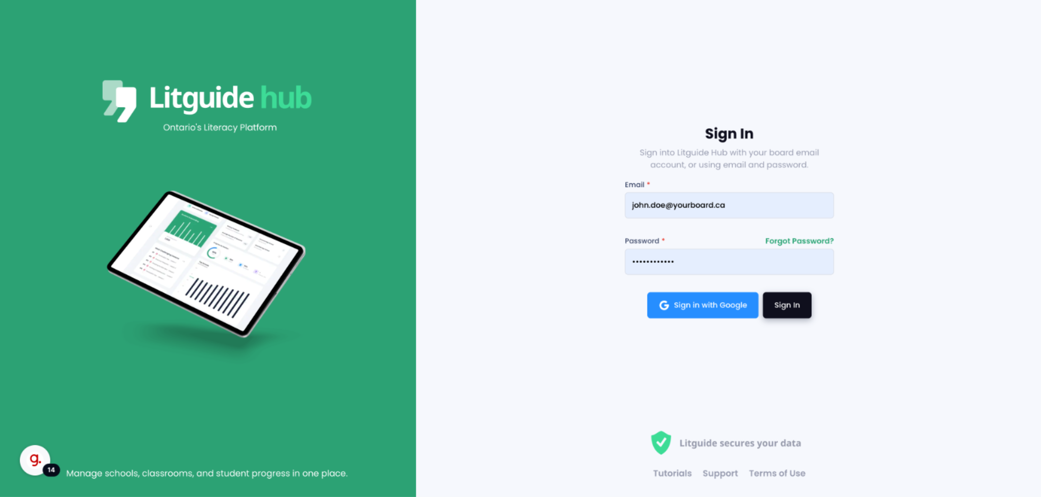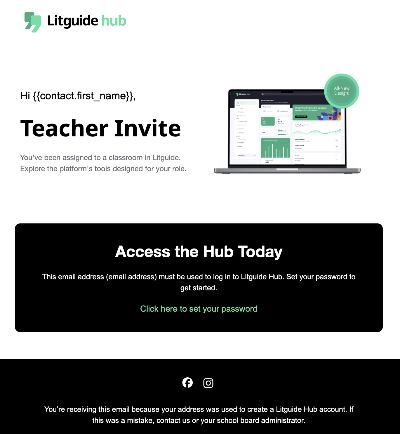 - Invite Email: School administrators (principals, vice principals, student success teachers, and literacy leads) have school-wide access to Litguide and must assign teachers to a class before an invite is sent If you haven't received an invite, contact your school administrator.